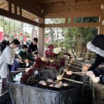 解体前のお祓いというと建物を解体する際に行うことが多いですが、今回は御神輿です。神事では毎年担いでいた八坂大神、亀ヶ池八幡大神を始めとし、その大地の神様とお祓いを司る神様を神籬にお招きします。そして、御神輿のお清めをし、今までの感謝のまごころを捧げる玉串奉奠行い、解体が無事安全にされることを祈念いたしました。