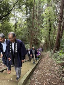 130段の石段を登る先に大己貴命(おおなむちのみこと)を御祭神としてお祀りする御本殿があります。参列者は階段を参進して御本殿に向かい、祭典は厳粛に斎行されました。