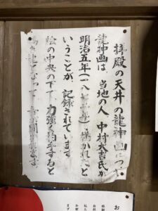 明治5年8月には、覆殿と拝殿の改築が施されるともに、社殿天井には中村大吉氏によって、龍の絵が奉納されました。