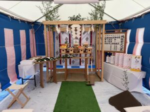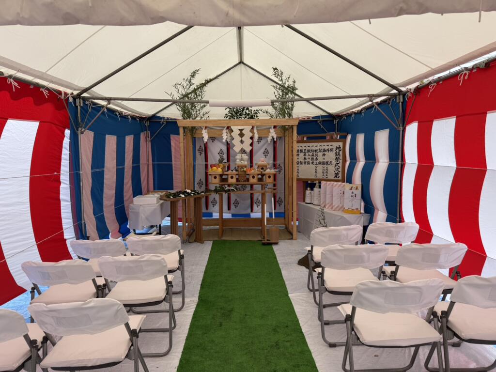 地鎮祭では、竹と注連縄で作った聖域に設けた神籬(ひもろぎ)に土地の神様やお祓いの神様をお呼びし、お供え物を捧げ、この土地に禍事がないよう、そして工事が無事安全に竣工するようお見守りくださいという旨の祝詞を奏上致します。