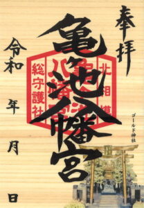 今月の御朱印は、境内社であるゴールド神社があしらわれています。交通安全、車のお祓い所のゴールド神社は、亀ヶ池八幡大神様のご分霊をお祀りしております。