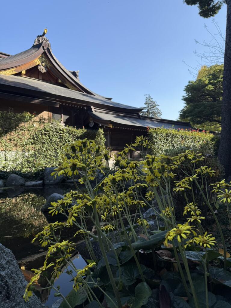 本日は境内に咲き誇るツワブキをご紹介いたします。御神池を背景にして菊に似た鮮やかな黄色の花が咲き、冬の始まりを彩ってくれています。この花は葉がつやのある蕗(ふき)の形であるため、始めはツヤフキと呼ばれていたそうです。それが変化して、ツワブキになったとのこと。秋になり御神苑の風景も少し寂しくなりましたが、季節の花を目にすると和やかな気持ちになります。これから一日一日と寒くなっていくことでしょう。皆様、体調管理には十分お気をつけ下さい。