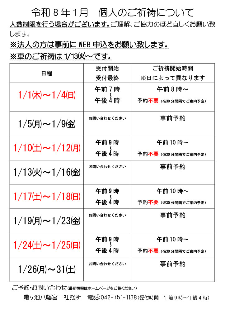 本日は令和8年の新年のご祈祷についてお知らせいたします。これまでWEBページ上にて公開していた情報よりも詳細に記載いたしましたので、ご祈祷をお考えの方はご一読をお願いいたします。WEBページも更新いたしました。