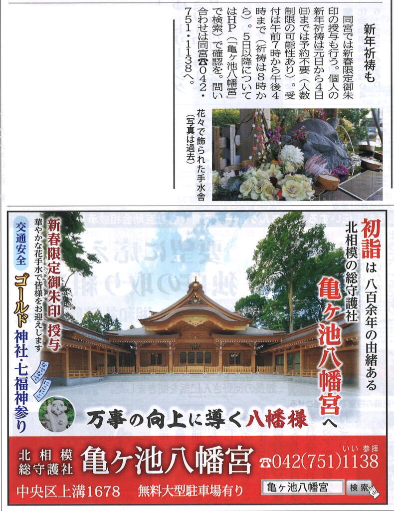亀ヶ池八幡宮のお正月参拝のご案内が、タウン誌のタウンニュースに掲載されています。相模原市内の緑区版・中央区版に掲載されていますので、ぜひお手にとって御覧ください。