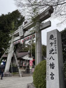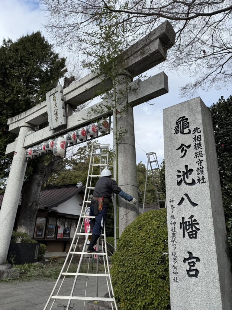 こちらは大鳥居前に照明を設置した写真です。その他のところにもライトや提灯などをたくさん取り付けて頂きました。これで足元が照らされ、少しでも安全に夜間参拝ができるかと思います。皆様の初詣、お待ちしております。